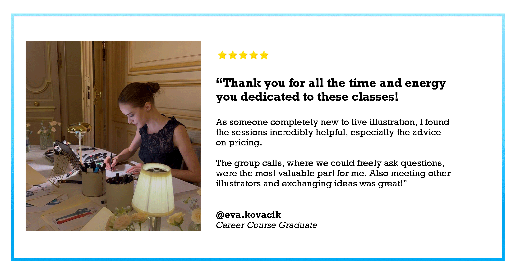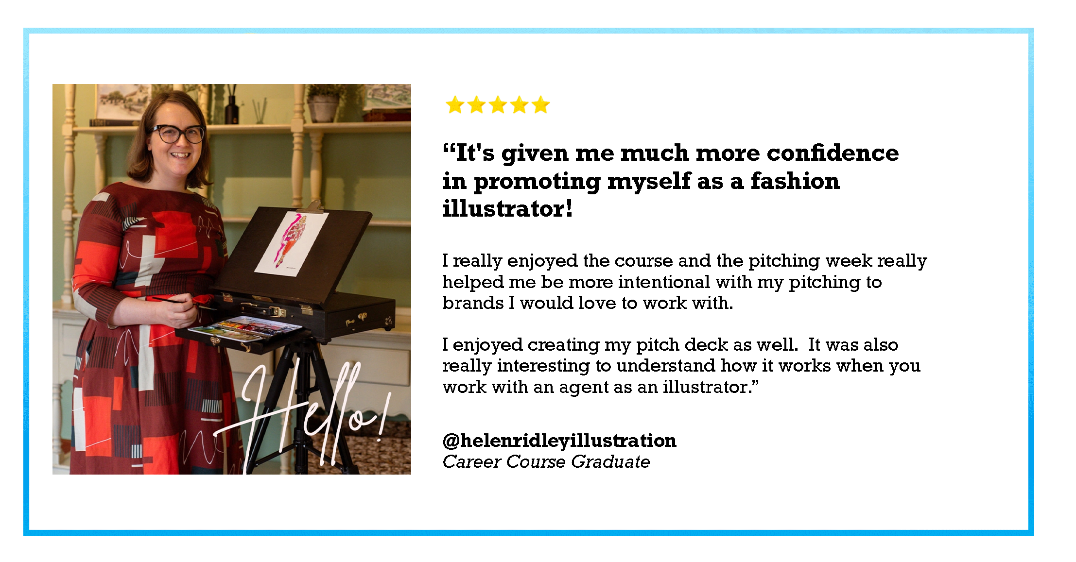 ⭐⭐⭐⭐⭐ "After the course I feel so much more confident" ⭐⭐⭐⭐⭐ "Scott’s course has been absolutely incredible!" ⭐⭐⭐⭐⭐ "Cannot recommend this course enough :))" ⭐⭐⭐⭐⭐ "From each module I gained a very valuable knowledge and helped me to start work on the fashion illustrator career." ⭐⭐⭐⭐⭐ "You provide a lot of useful information and help connect the dots! Thank you!"